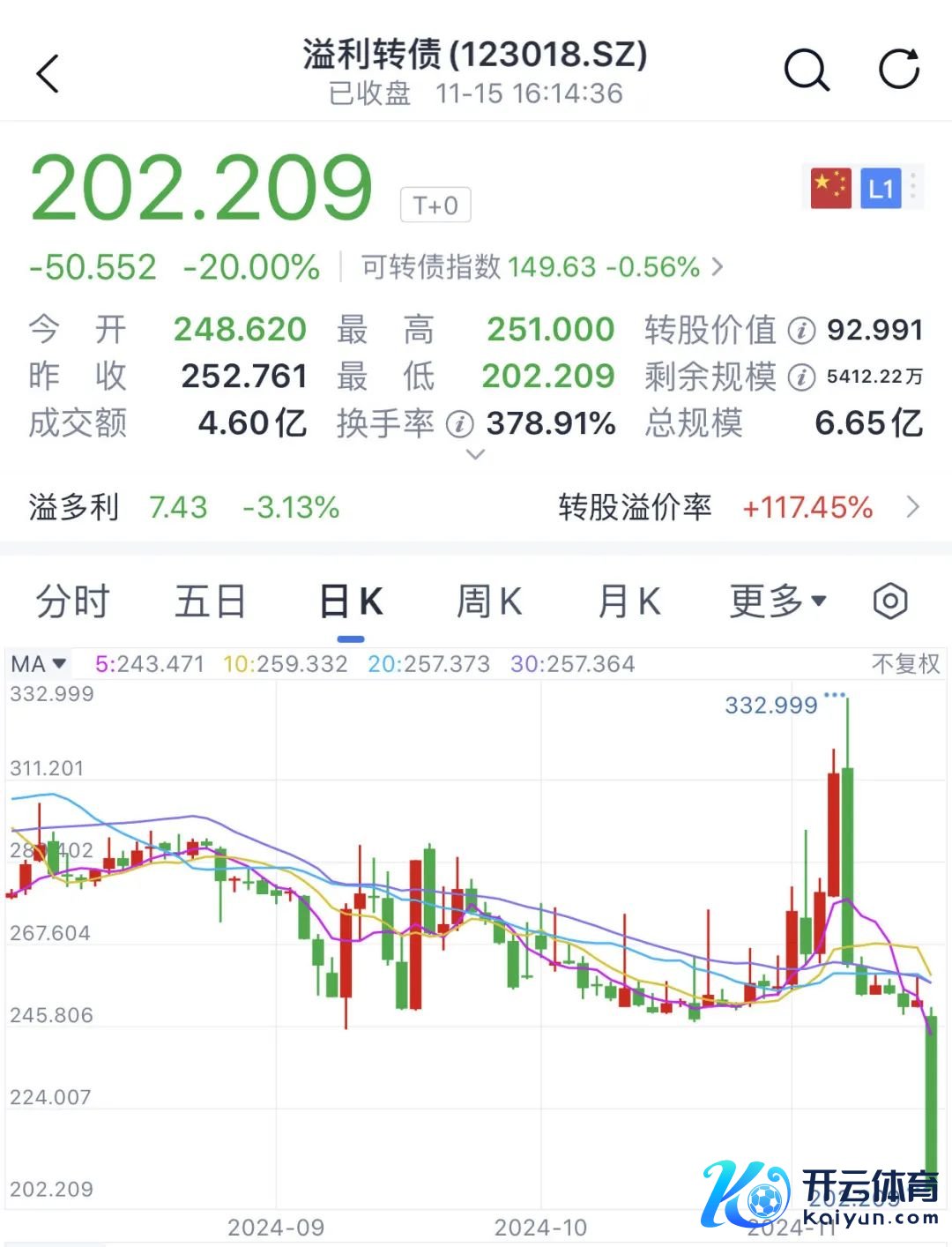在转债到期日左近的情况下,转债的时辰价值和其他期权价值寂静下降,导致溢利转债11月7日曾大跌16.24%,经过聚会多日的颤动整理后,11月15日再次大跌20%。