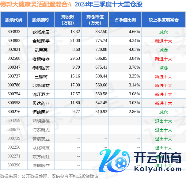 德邦大健康活泼建树搀杂A为搀杂型-活泼基金,证明最新一期基金季报知道,该基金金钱建树:股票占净值比91.35%,无债券类金钱,现款占净值比8.91%。基金十大重仓股如下: