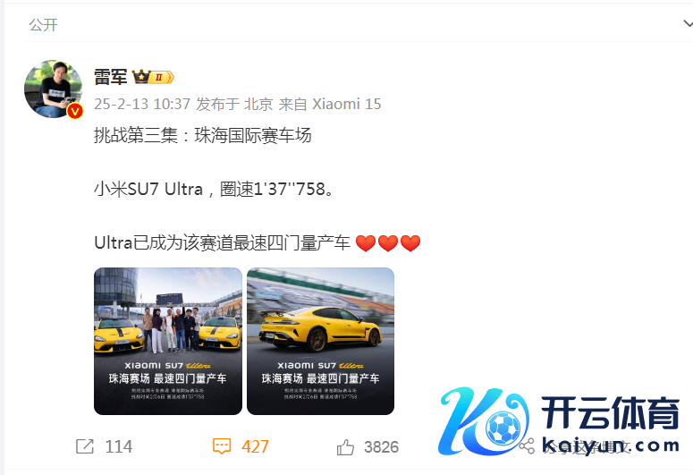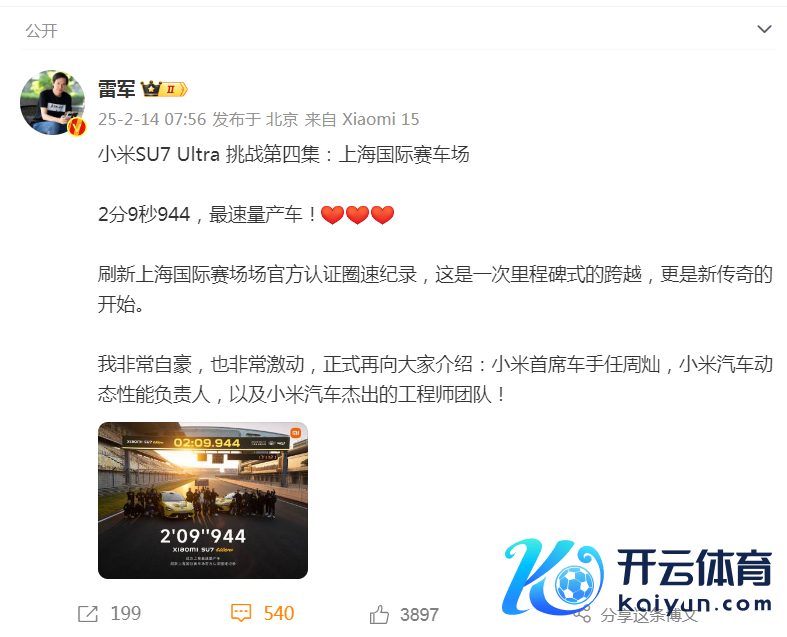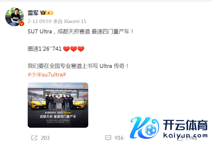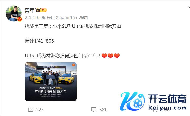 2月10日,小米创办东说念主、董事长兼CEO雷军发文称,小米SU7 Ultra开启宇宙专科赛说念的挑战,收货明日起连接公布。